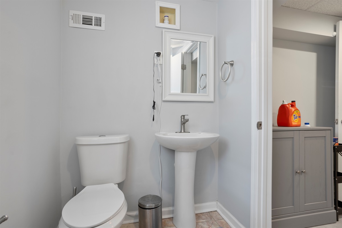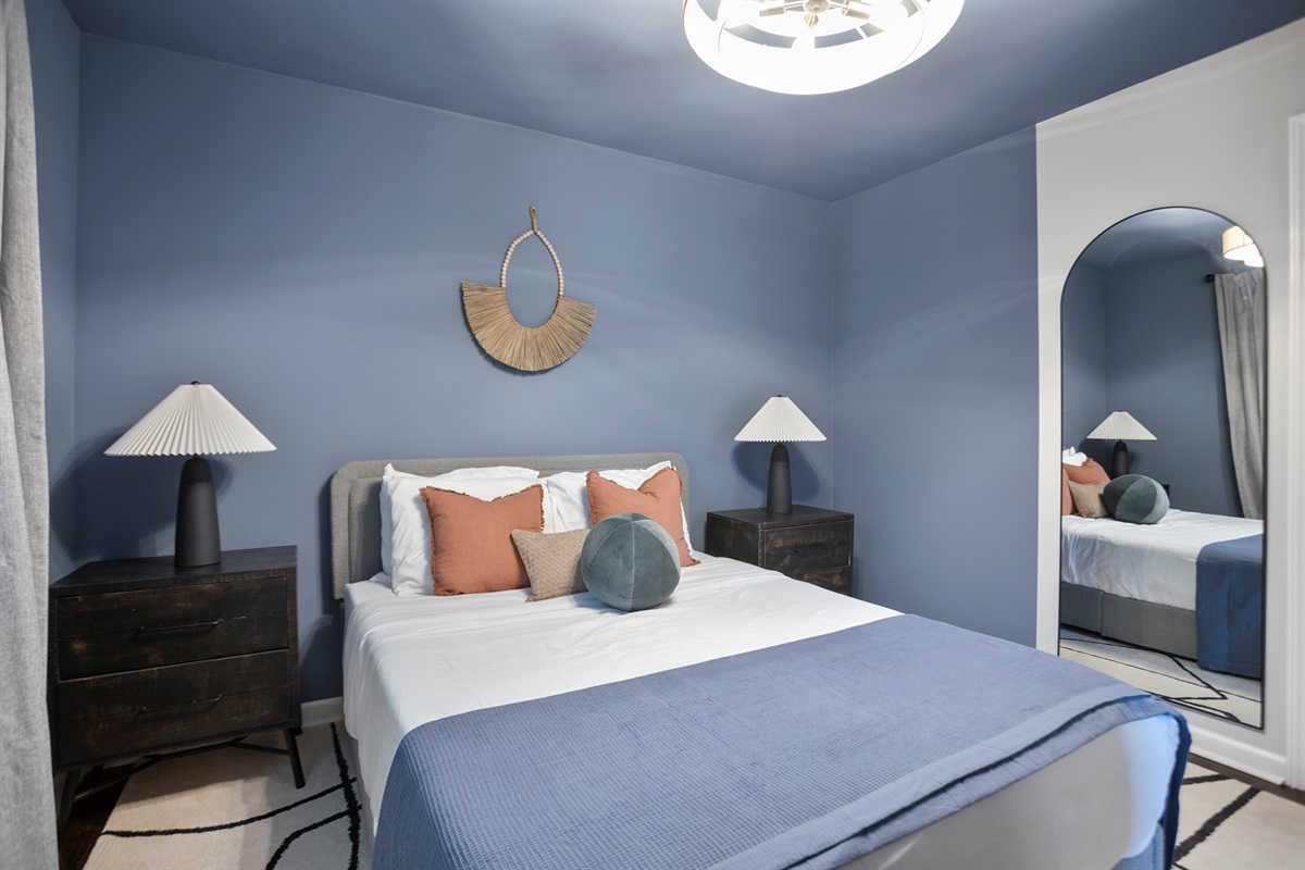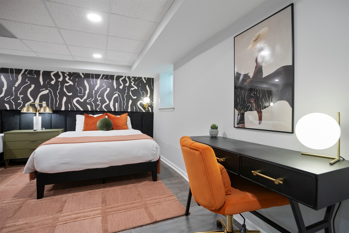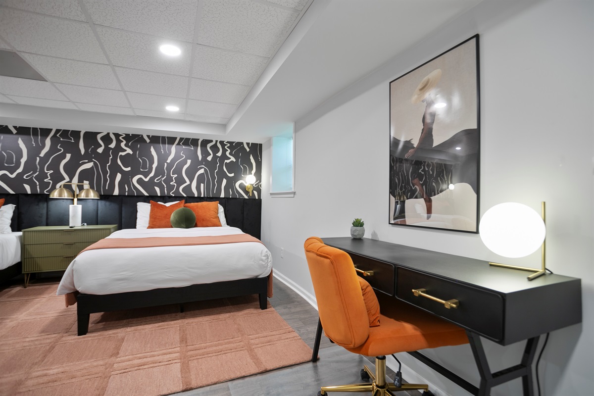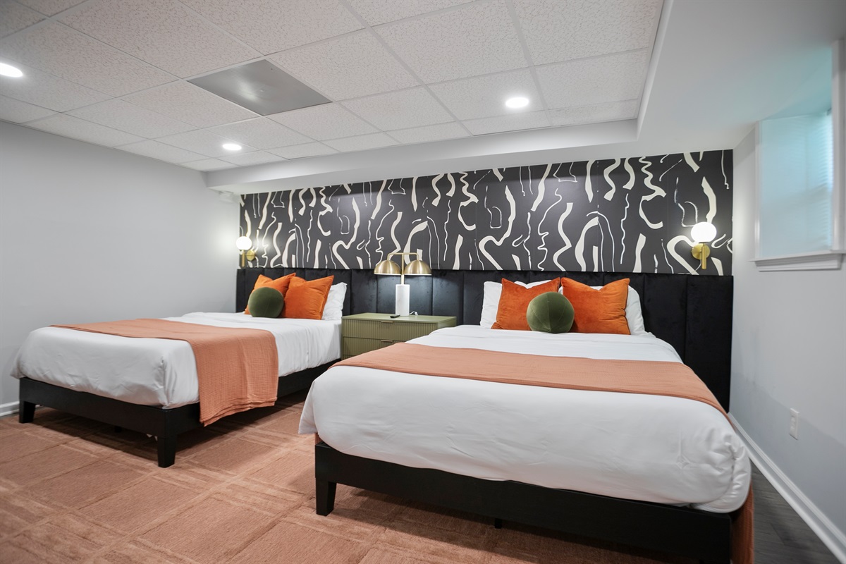 The lower level of the home features a tranquil double queen bedroom with its own 55-inch smart TV, ensuring everyone has ample space and comfort. The adjoining full bathroom adds convenience and privacy to your stay.