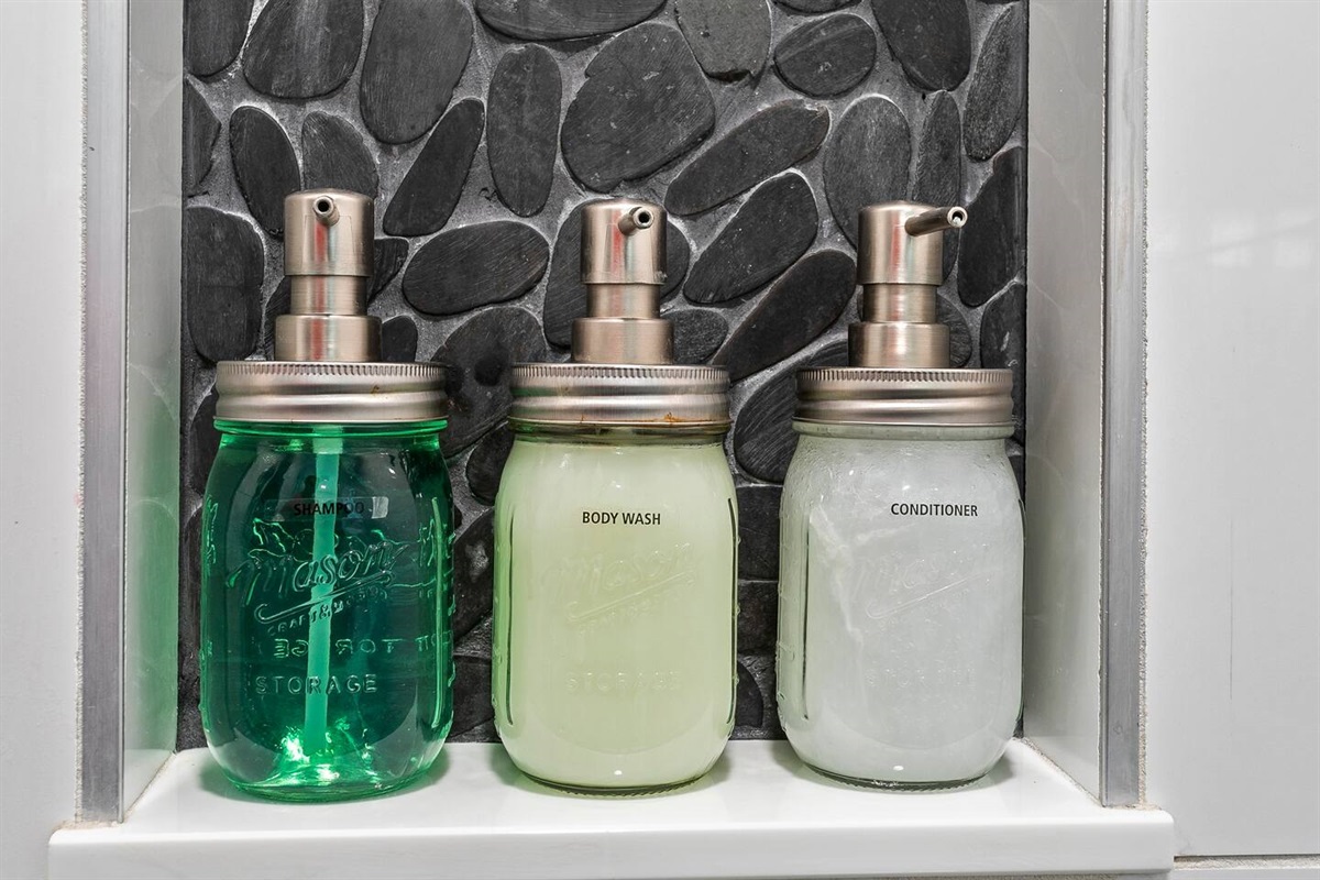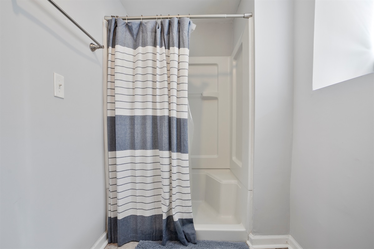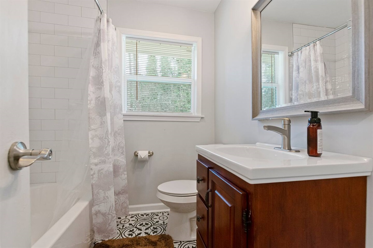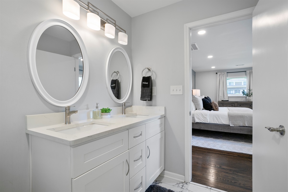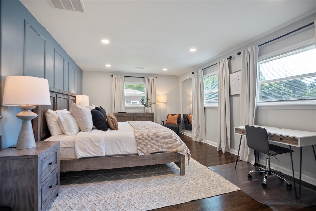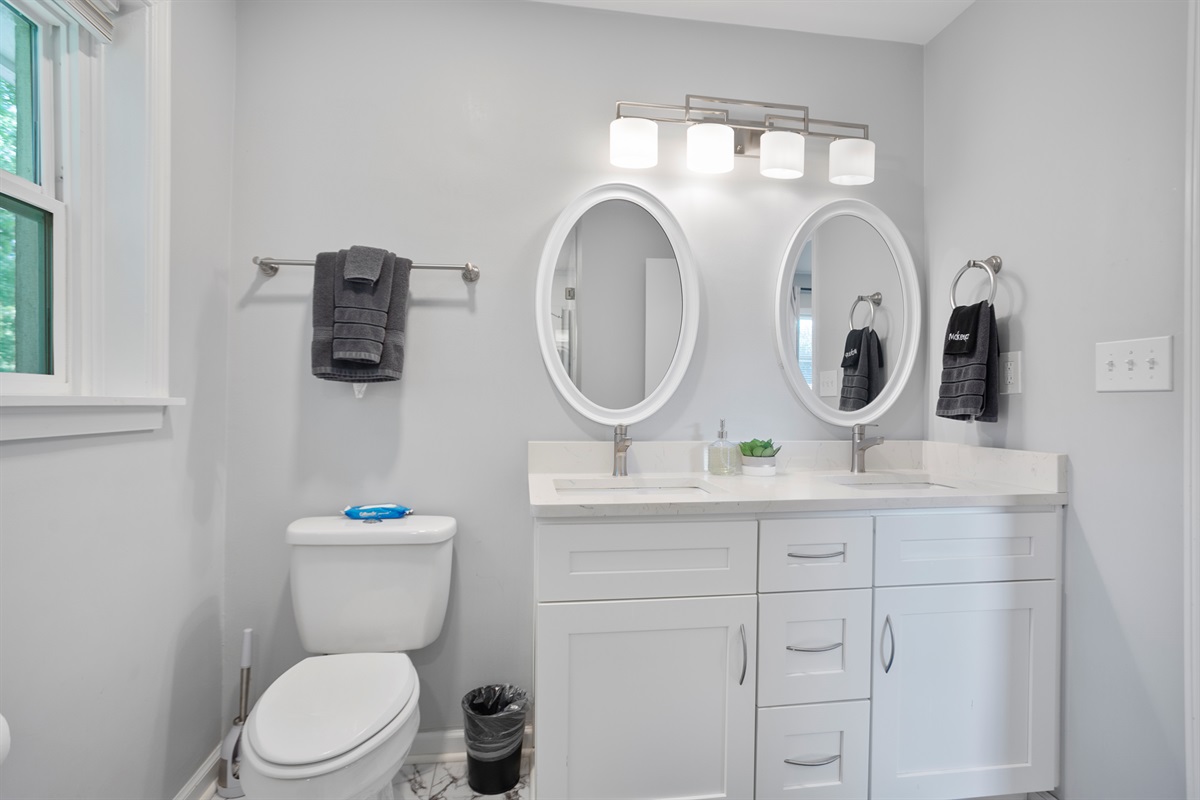 The lower level of the home features a tranquil double queen bedroom with its own 55-inch smart TV, ensuring everyone has ample space and comfort. The adjoining full bathroom adds convenience and privacy to your stay.