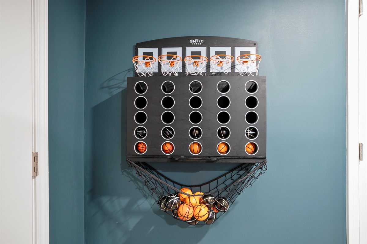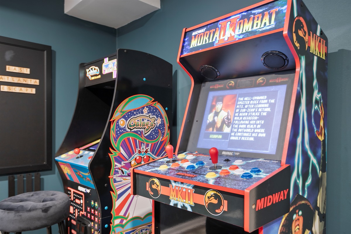 - Game Room: Get competitive in our dedicated game room with two arcade machines loaded with classics like Mortal Kombat, Pac-Man, and Galaga. Challenge friends and family to mini basketball, giant Connect 4, or test your skills on the multifunctional mini-games table offering pool, air hockey, foosball, and more. Host poker nights around our dedicated card table, perfect for unforgettable evenings!