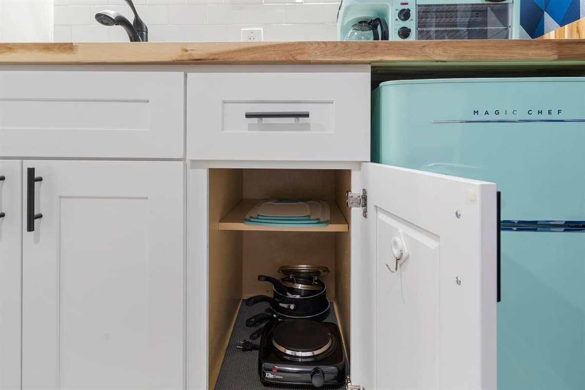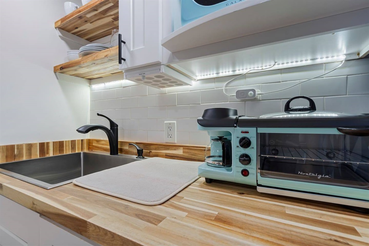 This suite boasts a large open bedroom with a smart tv and additional seating area with a movable laptop stand for work, a kitchenette with retro appliances and a full bathroom.