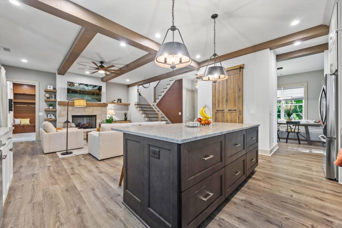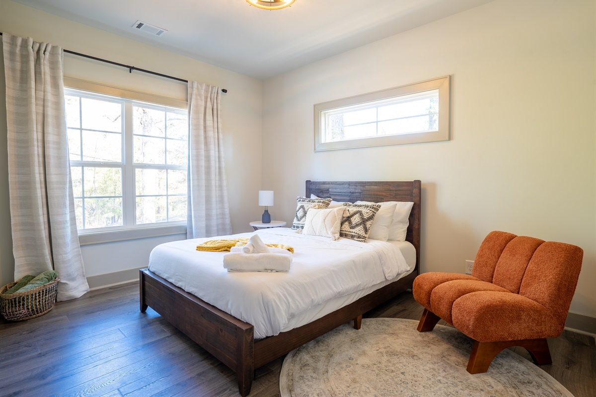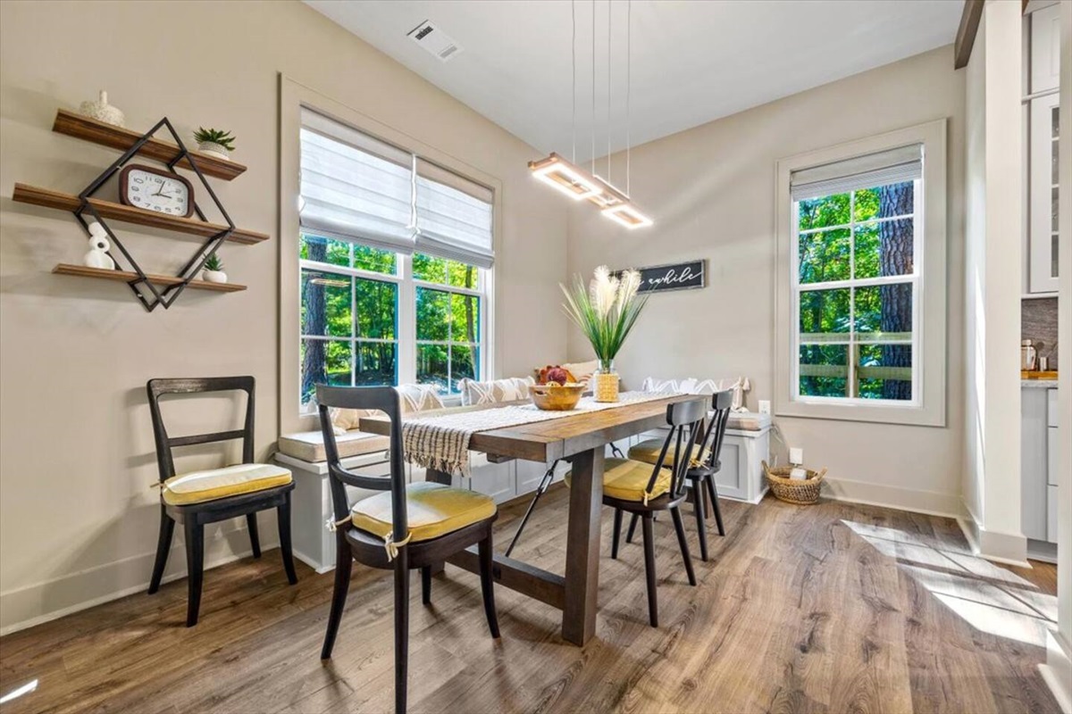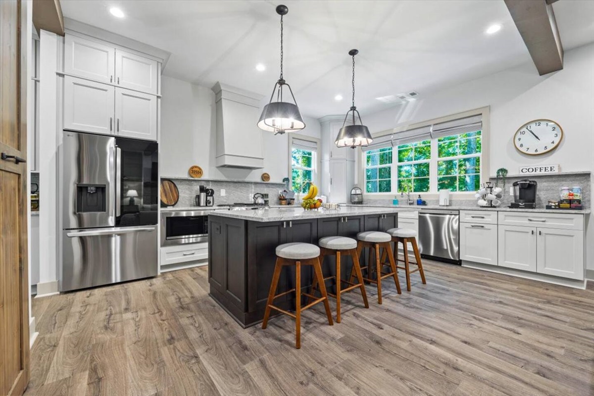 As you step inside our charming 4-bedroom, 3.5-bathroom lake house, you’ll be greeted by a warm and inviting living space featuring a cozy fireplace, perfect for unwinding after a day on the lake. The fully equipped kitchen and adjacent dining area make it easy to prepare and enjoy meals together, even as a large group. The gameroom, located in the garage, has plenty of light coming in through the big windows and lots of fun games to enjoy as kids and adults alike! The bedrooms which are designed for comfort and relaxation, are all located upstairs, ensuring a restful night's sleep.